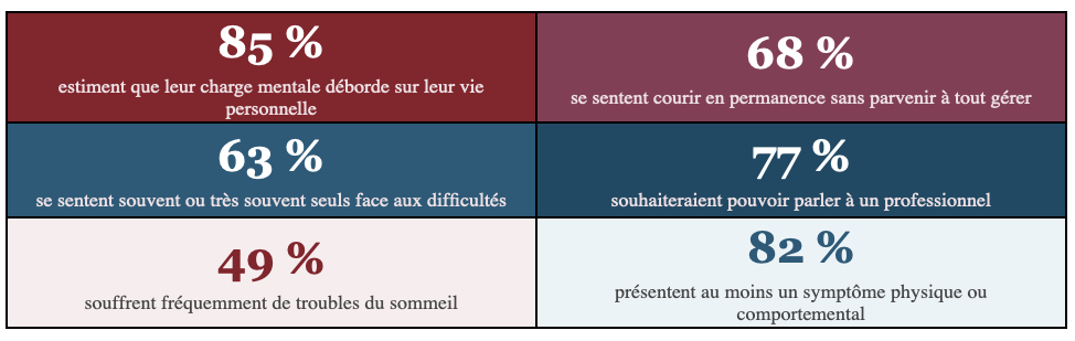 Les résultats dressent un tableau préoccupant. La surcharge mentale est le signal dominant du baromètre :