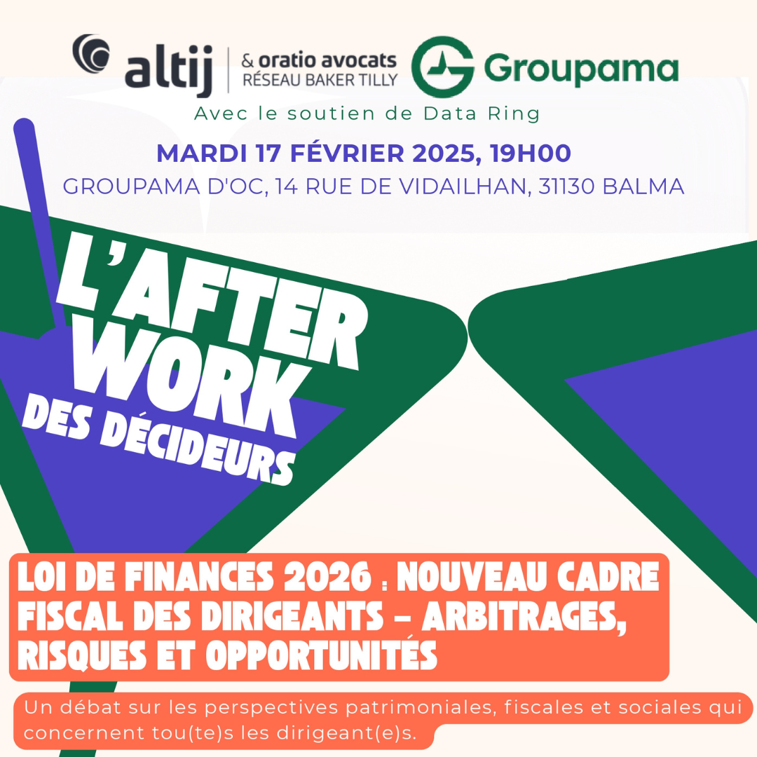 Le cabinet Altij & Oratio Avocats, et Groupama, avec le soutien de Data Ring, vous proposent un afterwork des décideurs dédié aux enjeux de la loi de finances 2026.