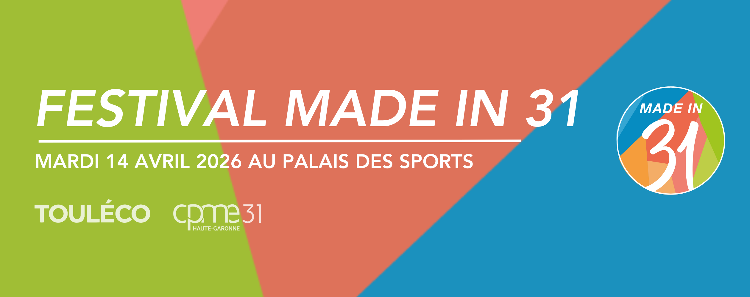 Festival Made In 31 – 7ème édition Le savoir-faire entrepreneurial en Haute-Garonne Date : Mardi 14 Avril 2026 Horaires : À partir de 14h00 Lieu : Palais des Sports André Brouat, 3 rue Pierre Laplace, 31000 Toulouse Retrouvez la 7ème édition du Festival Made In 31. Partez à la découverte des entreprises remarquables de la Haute-Garonne ! Inscription & informations à venir + Ajouter à mon Agenda Google + iCal / Outlook export Date mardi 14 Avr 2026 Heure Toute la journée Lieu Palais des Sport André Brouat 3 rue pierre laplace, 31000 toulouse Catégories Évènements Organisateur Touléco Autres organisateurs CPME 31