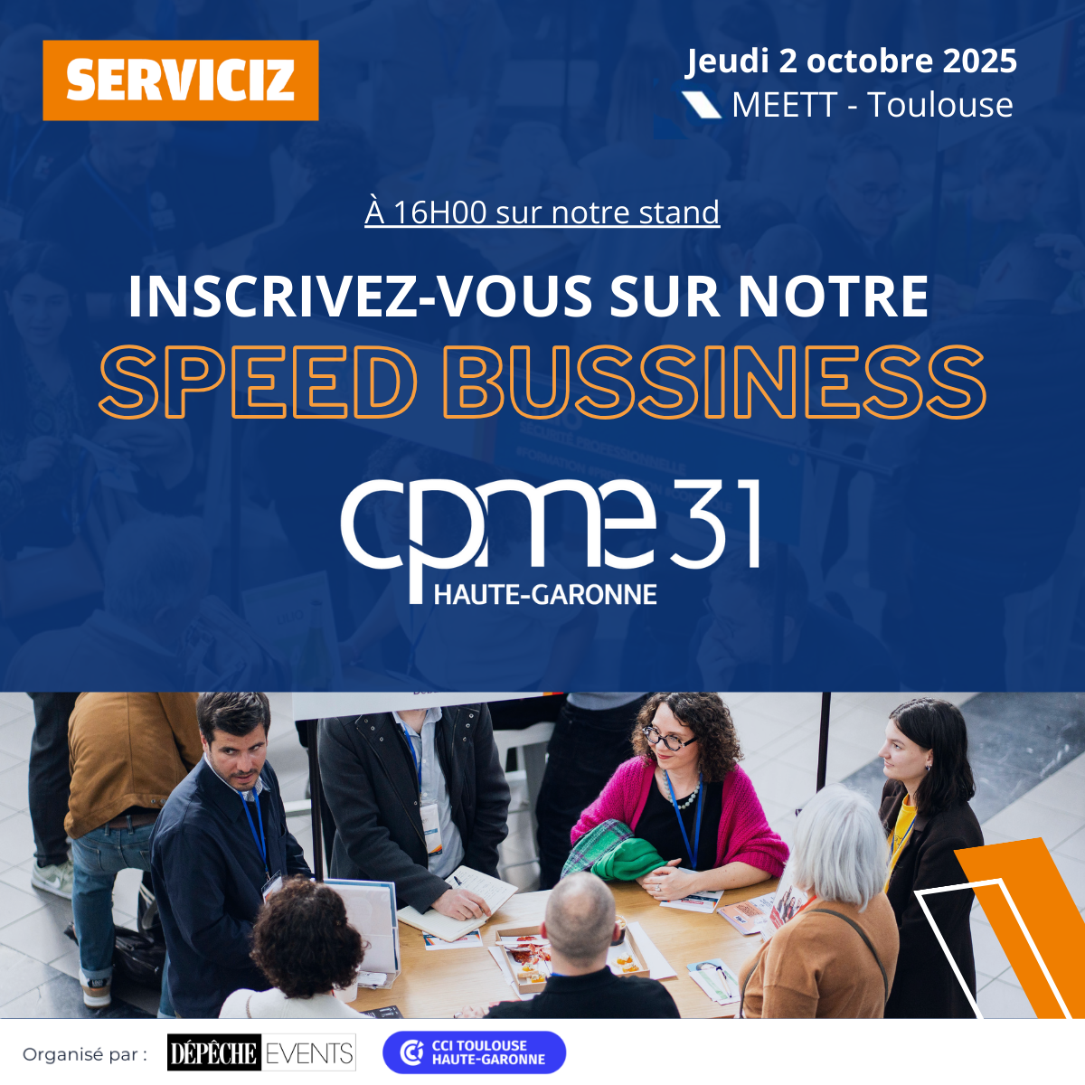Dans le cadre du Salon Serviciz, dédié aux services B2B, la CPME31 organise un speed business à 16H00 sur son pavillon. Rencontrez et échangez avec les entrepreneurs de la Haute-Garonne présents sur le salon. Au programme : des rencontres en 3 temps, par table de 5 personnes, pour vous permettre de découvrir un maximum de visiteurs !