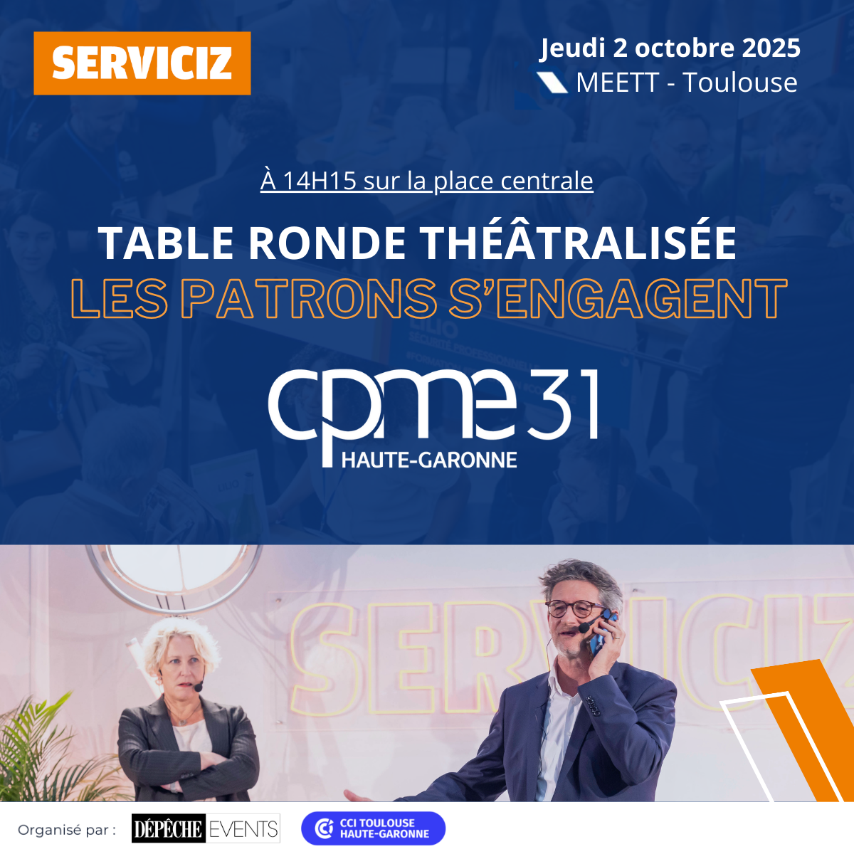 Lors du Salon SERVICIZ, la CPME31 vous donne rendez-vous pour une conférence inspirante sur la place centrale ! Une conférence interactive et porteuse de sens pour comprendre le rôle essentiel des entrepreneurs dans la vie économique et sociale de notre territoire.